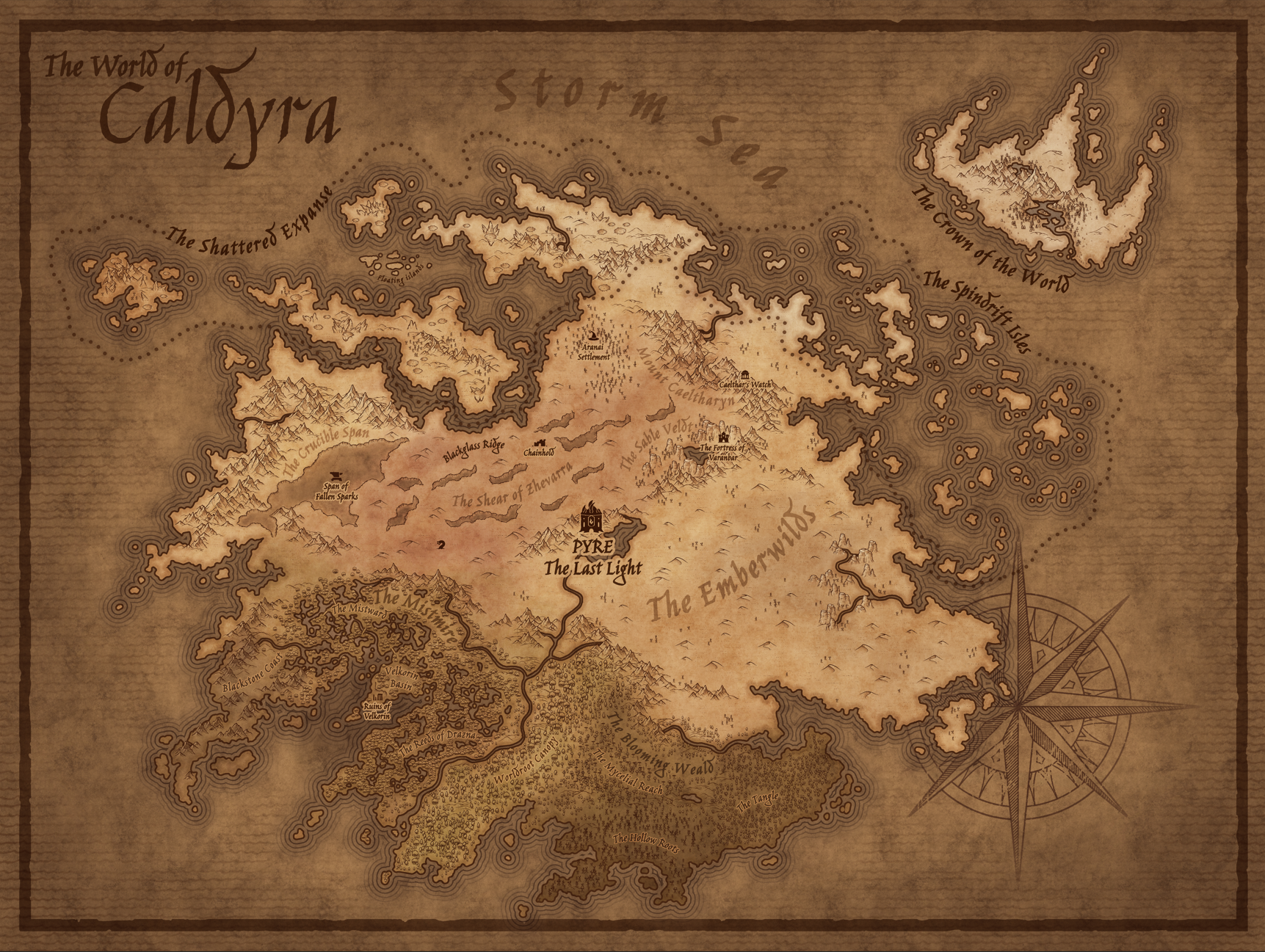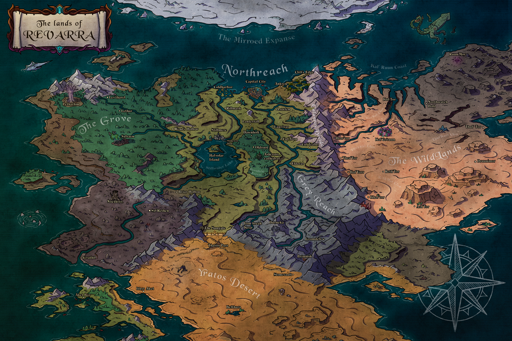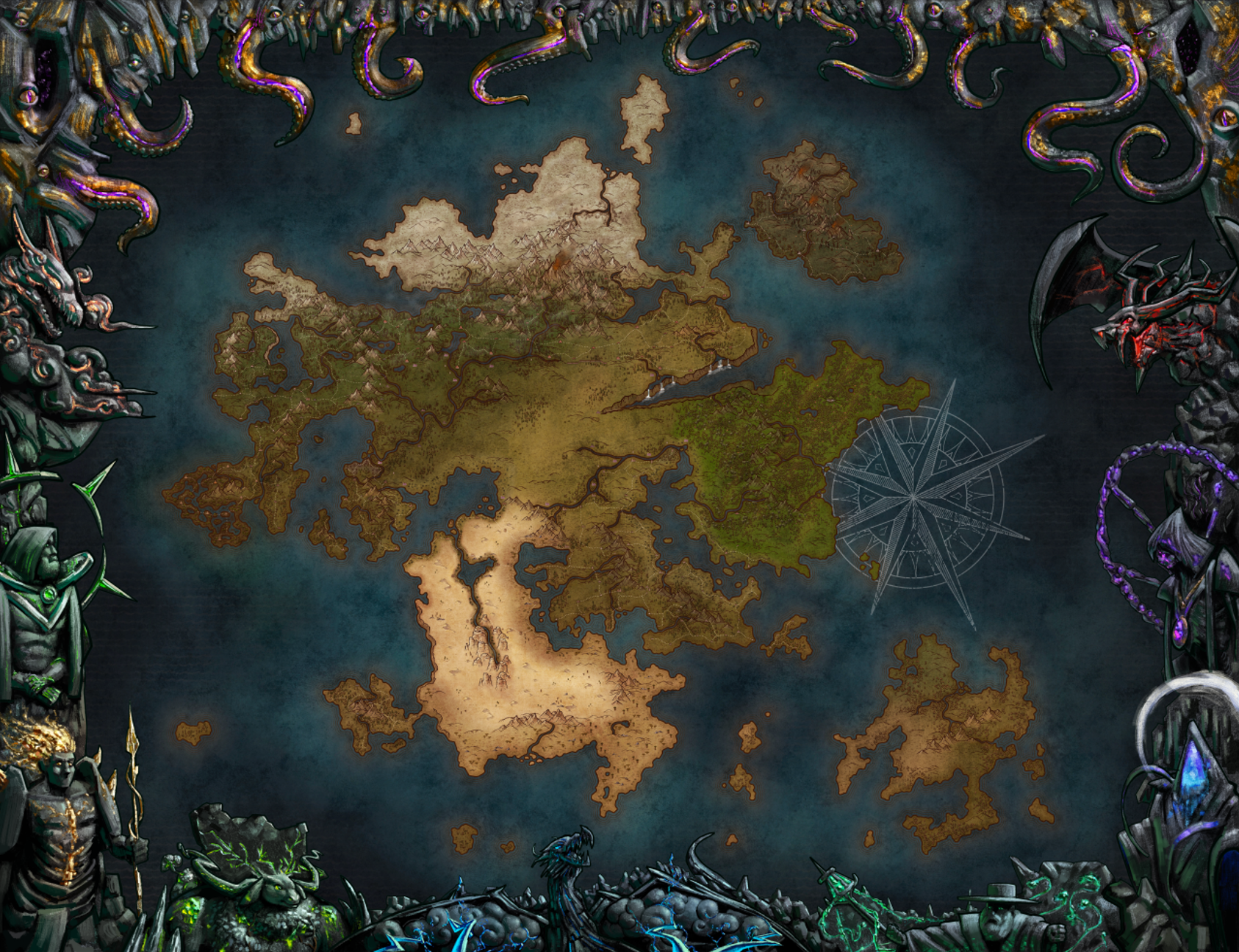 Maps designed in Inkarnate and polished in Photoshop, with new textures and color grading.